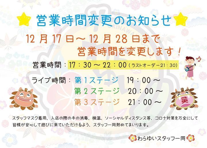 沖縄県の時短要請に伴い、12月17日より、営業時間を変更いたします‼