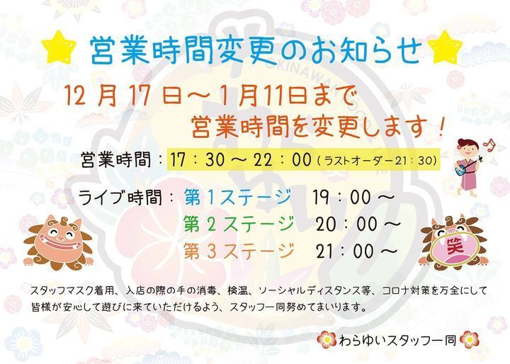 沖縄県の時短要請の延長に伴い、わらゆいも、営業時間変更の期間を延長いたします‼