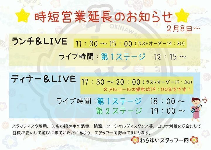 県の営業時間短縮要請の延長に伴い、2月8日からもひき続き20時までの営業となっております。