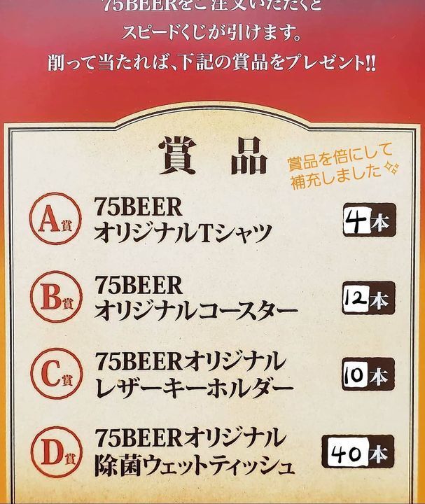 当店で#75ビール を1本注文頂いたお客様にはラッキーくじのチャンス!!