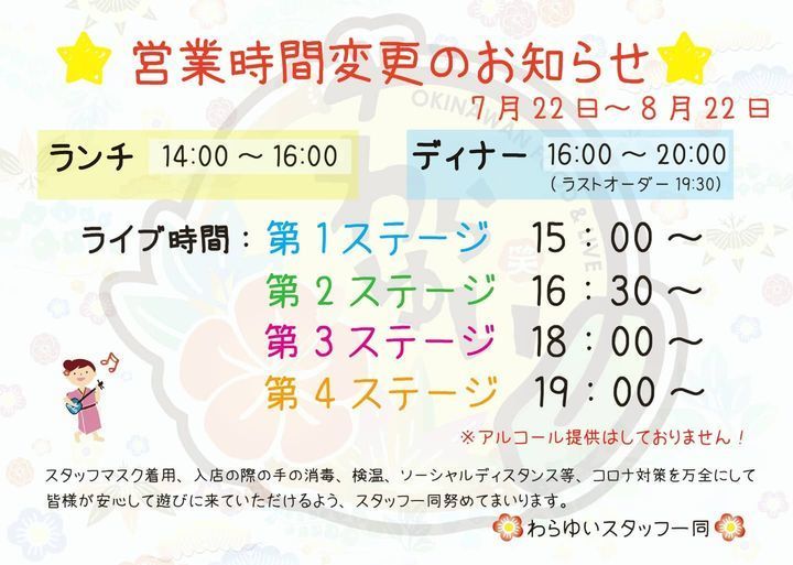 わらゆい は、7月22日から営業時間、ライブ時間を変更して営業を再開いたします‼