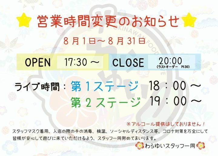 わらゆい は、8月1日から営業時間、ライブ時間を変更して営業いたします‼