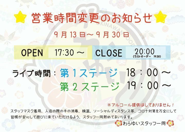 わらゆい は、9月13日から引き続き時短営業を延長してOPENしております‼