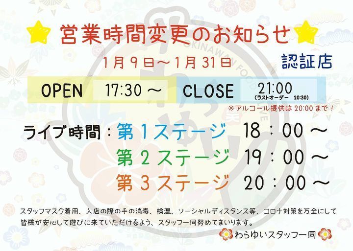 またまた時短営業という形になってしまいましたが、感染防止対策をしっかりして、少しでも皆様と楽しみたいと思いますので