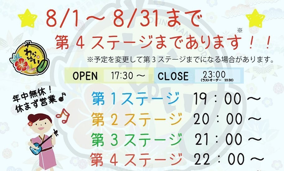 8月1日〜8月31日までの期間、毎日開催している島唄ライブを1ステージ追加して、1日4回ライブとなります!